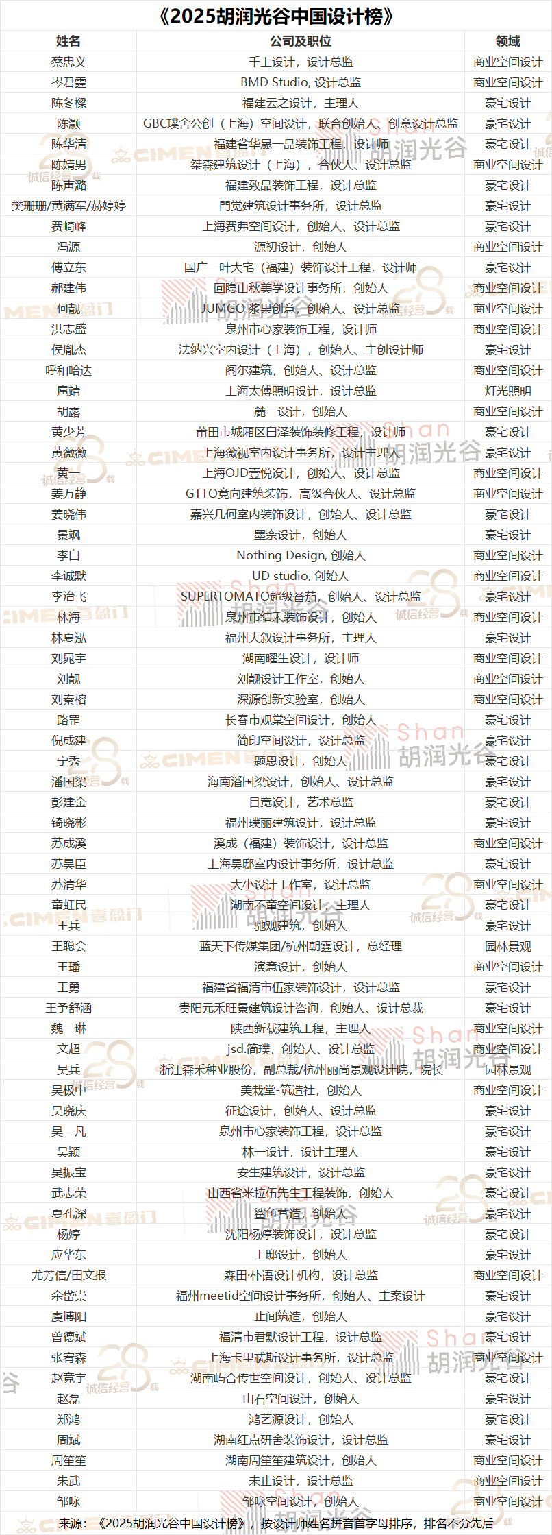 “胡潤研究院《高凈值人群消費心態(tài)及行為研究報告2025》顯示,高凈值人群的消費欲望及消費力仍顯著高于中產(chǎn),在整體的消費和品牌選擇上更傾向于消費升級。這表明,高凈值人群的消費更加注重品質(zhì)化與個性化。在此背景下,胡潤光谷聯(lián)合業(yè)內(nèi)意見領袖設計師發(fā)起品牌投票,征集他們心目中最推薦的品牌,從專業(yè)視角共同打造并發(fā)布全新子榜單——《2025胡潤光谷設計師推薦品牌》。”
