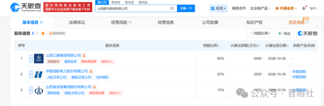 此外,上市央企華能國際出資2500萬元,持有山西華建25%股權(quán)。
