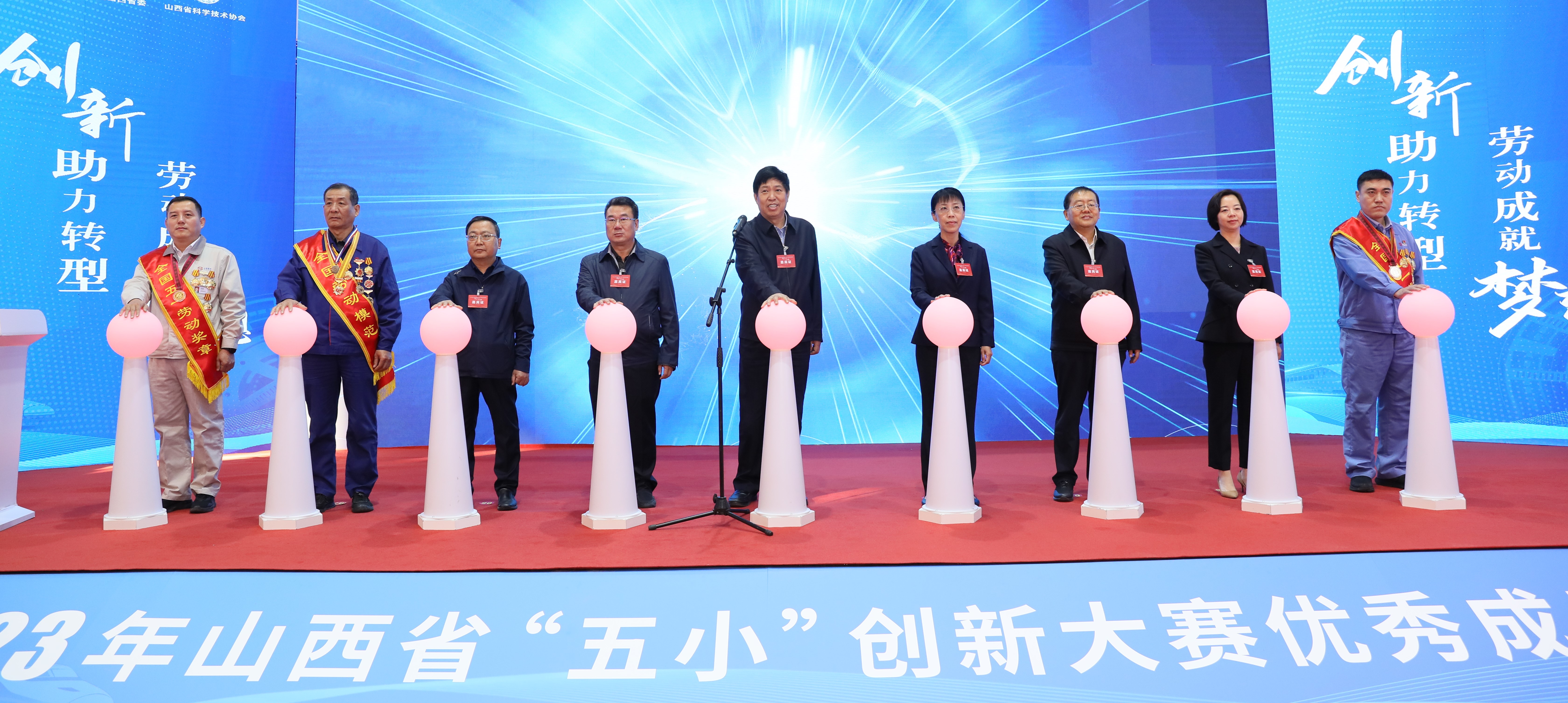 趙紅嚴(yán)代表省政府向成果展開幕表示祝賀。趙紅嚴(yán)強(qiáng)調(diào),全省各級(jí)工會(huì)、共青團(tuán)和科協(xié)要進(jìn)一步扛牢政治責(zé)任,充分發(fā)揮群團(tuán)組織優(yōu)勢(shì),將“五小”創(chuàng)新大賽持續(xù)引向深入。要進(jìn)一步提升大賽質(zhì)量,推動(dòng)大賽內(nèi)容更加豐富、方式更加新穎、載體更加多元、群眾參與熱情更加高漲、成果推廣交流更加廣泛高效、成果轉(zhuǎn)化落地更加快速順暢,切實(shí)提升大賽的影響力和美譽(yù)度。要進(jìn)一步抓好平臺(tái)打造,加快推進(jìn)工匠學(xué)院、勞模創(chuàng)新工作室、“鄉(xiāng)村E站”等創(chuàng)新平臺(tái)建設(shè),著力打造特色鮮明、社會(huì)認(rèn)可的實(shí)踐陣地,實(shí)現(xiàn)生產(chǎn)實(shí)踐、創(chuàng)新創(chuàng)造、能力提升協(xié)同并進(jìn),讓廣大職工群眾的聰明才智充分涌流、創(chuàng)造活力競(jìng)相迸發(fā),凝聚起推進(jìn)中國(guó)式現(xiàn)代化山西實(shí)踐的磅礴力量。要按照省委十二屆六次全會(huì)部署和剛剛召開的全省領(lǐng)導(dǎo)干部會(huì)議精神,在省委、省政府的堅(jiān)強(qiáng)領(lǐng)導(dǎo)下,把鼓勵(lì)支持創(chuàng)新放在更加突出的位置,進(jìn)一步激發(fā)全社會(huì)的創(chuàng)新熱情,一張藍(lán)圖繪到底,一年接著一年干,團(tuán)結(jié)引領(lǐng)廣大職工群眾為我省加快高質(zhì)量發(fā)展不斷作出新貢獻(xiàn)、展現(xiàn)新作為。
