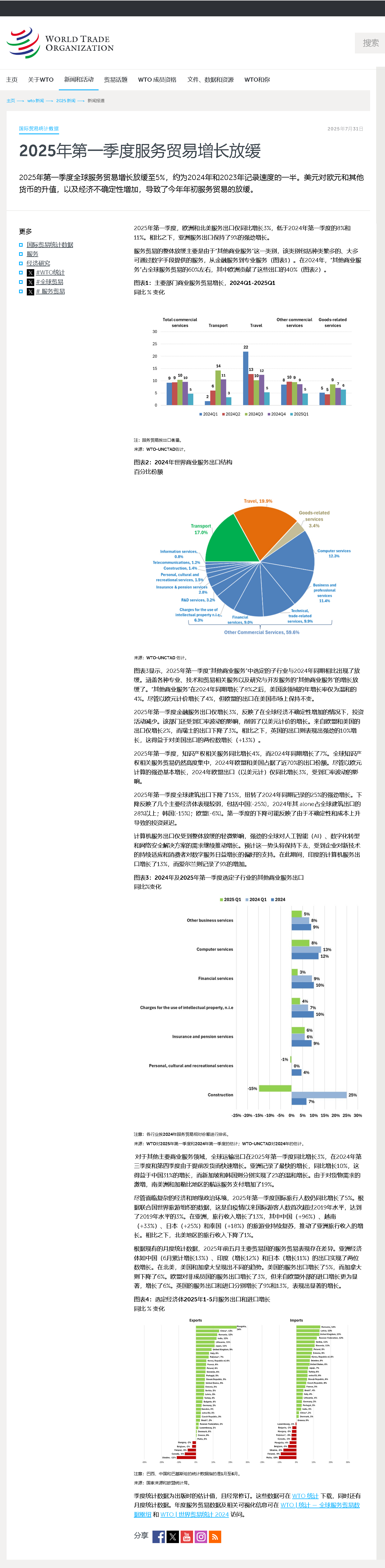 當(dāng)?shù)貢r(shí)間7月31日,世貿(mào)組織發(fā)布最新數(shù)據(jù)顯示,2025年第一季度,全球服務(wù)貿(mào)易增速放緩至同比增長(zhǎng)5%,約為2024年和2023年增速的一半。