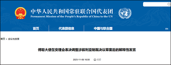 中國(guó)常駐聯(lián)合國(guó)代表團(tuán)網(wǎng)站11月6日消息,中國(guó)常駐聯(lián)合國(guó)代表傅聰大使在安理會(huì)表決調(diào)整涉敘利亞制裁決議草案后作解釋性發(fā)言,對(duì)決議未能回應(yīng)有關(guān)各方合理關(guān)切表示遺憾。