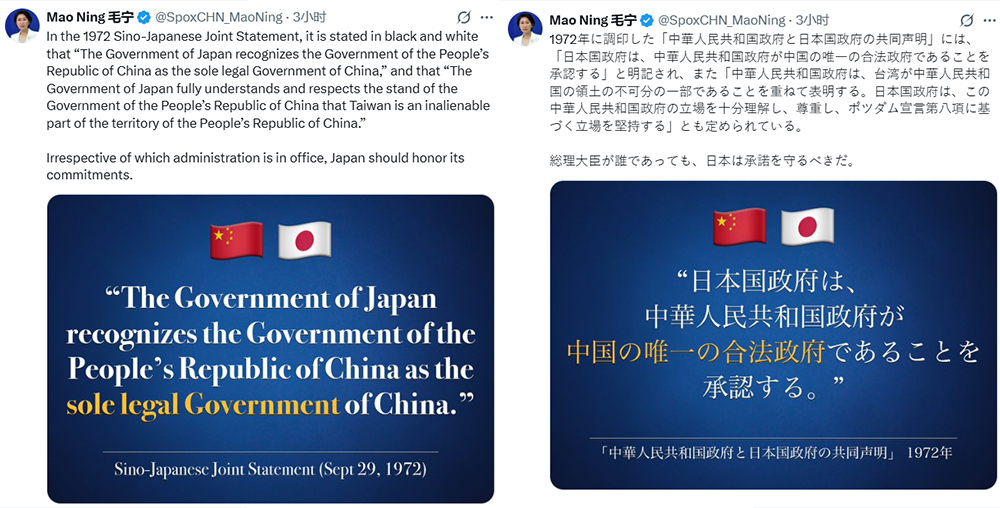 11月16日,中國外交部發(fā)言人毛寧在X網站用英語、日語雙語發(fā)布2組共4張海報,援引1972年《中日聯合聲明》中涉臺內容,提醒日方:“無論誰當政,日本都必須信守承諾”。