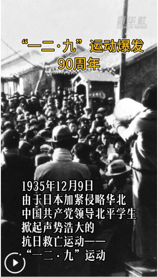 1935年12月9日,在中共北平臨時工委的領(lǐng)導(dǎo)下,多所高等院校和部分中學(xué)的數(shù)千名學(xué)生涌上北平街頭,舉行聲勢浩大的抗日救亡游行,“一二·九”運動爆發(fā)。