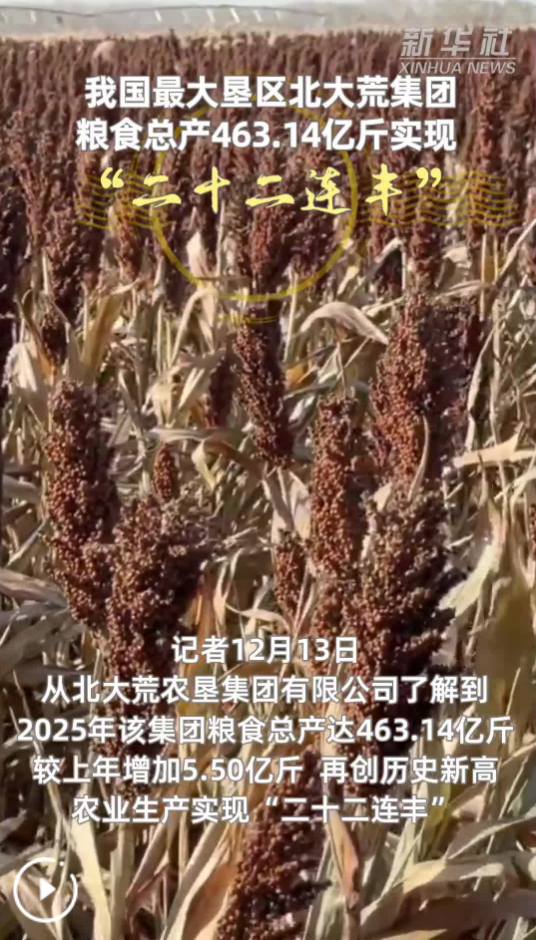 新華社哈爾濱12月14日電(記者黃騰)記者12月13日從北大荒農(nóng)墾集團有限公司了解到,2025年該集團糧食總產(chǎn)達463.14億斤,較上年增加5.50億斤,再創(chuàng)歷史新高,農(nóng)業(yè)生產(chǎn)實現(xiàn)“二十二連豐”。