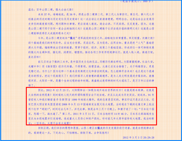 因此,2012年12月23日,太陽照樣會(huì)一如既往地升起在世界的東方!這就是根本規(guī)律,這就是大自然的自然現(xiàn)象!到時(shí)候杞人憂天的所謂瑪雅預(yù)言會(huì)不攻自破,并且從此成為歷史笑談。說起來,91年曾經(jīng)有人和我打賭諾查丹馬斯預(yù)言1999年地球大爆炸,我的態(tài)度是否定的,事實(shí)印證只是泛泛之論。還有巴西大預(yù)言家朱瑟里諾說2008年9月13中國海南發(fā)生毀滅性大地震,當(dāng)時(shí)我在下載的這篇文章上批注兩個(gè)紅字“胡說!”,時(shí)間過去幾年了,并無此事。倒是去年三月十日晚上,和妻子說了一句:“日本這個(gè)國家,忽塌一下,海水淹了。”第二天,2011年3月11日,日本當(dāng)?shù)貢r(shí)間14時(shí)46分,日本東北部海域發(fā)生里氏9.0級地震并引發(fā)海嘯,造成重大人員傷亡和財(cái)產(chǎn)損失。針對前幾年太原市謠傳有大地震,我當(dāng)時(shí)斷言:一百年內(nèi),太原不會(huì)有大地震!