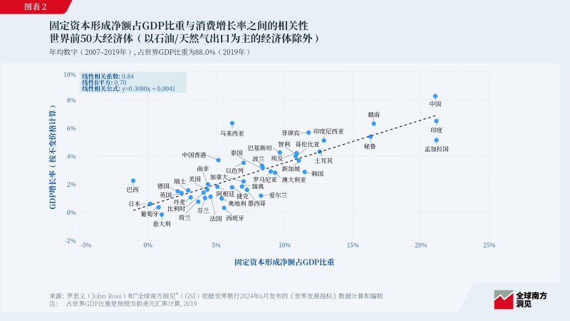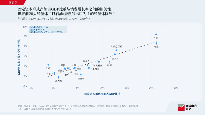 固定資本形成凈額占GDP比重與消費增長高度相關(guān),且經(jīng)濟規(guī)模越大相關(guān)性越強